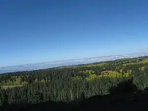 The Grand Mesa is a large mesa in western Colorado in the United States. It is the largest flat-topped mountain in the world.[1] It has an area of about 500 square miles (1,300 km2) and stretches for about 40 miles (60 km) east of Grand Junction between the Colorado River and the Gunnison River, its tributary to the south. The north side of the mesa is drained largely by Plateau Creek, a smaller tributary of the Colorado. The west side is drained largely by Kannah Creek, which is received to the west by the lower Gunnison River. The mesa rises about 6,000 feet (1,800 m) above the surrounding river valleys, including the Grand Valley to the west, reaching an elevation of about 11,000 feet (3,400 m). Much of the mesa is within Grand Mesa National Forest. Over 300 lakes, including many reservoirs created and used for drinking and irrigation water, are scattered along the top of the formation. The Grand Mesa is flat in some areas, but quite rugged in others.