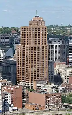 The Grant Building is 40-story, 147.8 m (485 ft) skyscraper at 310 Grant Street in downtown Pittsburgh, Pennsylvania. The building was completed and opened on February 1, 1929[5] at a cost of $5.5 million ($93.7 million today). The Art Deco building's facade is built with Belgian granite, limestone, and brick. It was famous for a radio antenna that rose roughly 100–150 feet (30–46 m) from the roof of the tower and had an aviation beacon that spelled out .--. .. - - ... -... ..- .-. --. .... or P-I-T-T-S-B-U-R-G-H in Morse Code. The beacon could be seen as far away as 150 miles (240 km) on clear nights. A smaller version of the beacon, still flashing out the name of the city remains to this day, although malfunctions with the relay switch caused it to spell "P-I-T-E-T-S-B-K-R-R-H", and eventually "T-P-E-B-T-S-A-U-R-G-H" before being repaired on July 27, 2009.[6]