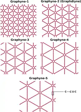 Graphyne-n varieties, where n indicates the number of carbon–carbon triple bonds in a link between two adjacent hexagons. Graphyne is graphyne-1; graphdiyne is graphyne-2.