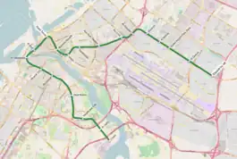 The Green Line is one of the two lines in the Dubai Metro network in Dubai, United Arab Emirates. It runs through Deira and Bur Dubai, generally parallel to Dubai Creek.[2] There are 20 stations on the line, spanning from Etisalat to Creek (numbered 11 to 30 in zones 5 and 6) covering 22.5 km (14.0 mi).[1] It was built by a consortium of Mitsubishi, Obayashi, Kajima and Yapı Merkezi.[3]