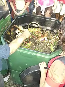 Green waste can be collected via municipal curbside collection schemes or through private waste management businesses. Many communities, especially in the United Kingdom, have initiated green waste recycling and collection programs in order to decrease the amount of biodegradable materials in landfills.[1] Communities are provided with, or can provide their own, compost receptacles that they fill with plant and food remains, which are then emptied on a regular basis. Programs such as this allow communities to be an active part of composting their green waste which allows them to play an active role in decreasing the amount of food being dumped into local[2] and regional landfills.[1]