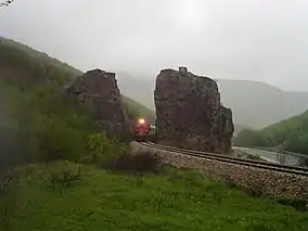 The rocks are next to the highway from Drenas to Obiliq, and the railway line from Kosovo Polje to Peja runs between them. A single rock was dynamited to make way for the track in 1936. Many myths and legends have arisen around the stones.[2][3]