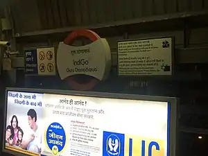 The station is named after Drona, a master of advanced military arts and guru in the Mahabharata. In November 2015, the station was rebranded after budget airline IndiGo.