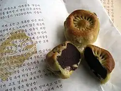 Gyeongju bread is made from a mixture of eggs and wheat flour, with the red bean filling being almost 70% of the pastry. A chrysanthemum would be traditionally imprinted on the top.[2] Gyeongju bread has been designated as an "outstanding regional specialty" (지역명품) by the Korean government.[3][4]