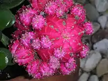 Gymnocalycium mihanovichii is a species of cactus from South America.[2] The most popular cultivars are varied mutants which completely lack chlorophyll, exposing the red, orange, or yellow pigmentation. These mutant strains are often grafted onto the hylocereus cactus, and the combined plant is called a "Moon Cactus".[3][4][5][6] Moon cacti are commonly grown as houseplants and are also known as Ruby Ball, Red Cap, Red Hibotan, or Hibotan cacti.