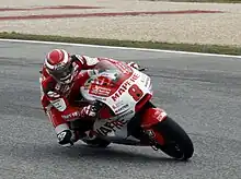 In the 2009 250cc world championship, Barberá won three races along with five other podium results to finish second to Honda's Hiroshi Aoyama.[2] Barberá won the 2009 Valencia Grand Prix, the final two-stroke, 250cc race in Grand Prix history, as the class was to be discontinued in favor of the four-stroke Moto2 class in 2010.[2] On 20 August 2009 it was announced Barberá would move to MotoGP in 2010, riding for the Aspar Team aboard Ducati customer bikes.[4][5] Barberá finished the 2010 MotoGP season in twelfth place, and followed on in eleventh place in 2011. On 7 November 2011, it was announced that he was moving to Pramac Racing for the 2012 season.[6]
