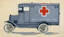 During the Spanish–American War, Saÿen was assigned to the army hospital at Ft McPherson, Georgia.[1] In a brief article[6] published at the end of that war, Saÿen described his military service, the status of medical x-rays in the Army at that time, and also proposed the construction of a mule-driven x-ray laboratory for field use. This proposal was never implemented. In 1917, as the United States drifted towards war once again, Saÿen updated his 1898 concept to an "Automobile X-Ray Unit". He wrote a detailed proposal[7] for five fully outfitted x-ray ambulances at an estimated cost of $2,000 apiece. They were to be sent to France in support of the volunteer force that was being organized under former president Theodore Roosevelt.[3] The vehicles were to be privately financed and Saÿen had recruited artists from the Philadelphia Sketch Club to staff the ambulance teams.[3] A drawing of the vehicle by Saÿen is attached (NMAH Accession file 267872). It is clear from his proposal that Saÿen had stayed up-to-date with x-ray technology because he recommended the use of the new Coolidge x-ray tube which had made the early tubes, including his own design, obsolete. Preferring to field an expeditionary force of regular army units, President Wilson declined to deploy Roosevelt's army and it was subsequently disbanded. Although Saÿen's plan for mobile military x-ray units was never realized, mobile x-ray units were designed and deployed by England, France and the United States.[8]