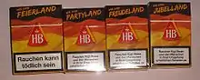 As is customary in the industry, the HB brand has from time to time published cigarette packs that deviate from the standard design, with special motifs intended to make customers curious and bound to the brand. For example, at the beginning of the 1990s HB had the "Undercover" special series, in which the cigarette packs were completely black, and in 2004 the "Growing Regions" special series, which presented tobacco growing areas to the consumer, as well as – matching the European Football Championship 2008 – the Wir sind Feierland (literally: 'We are Celebration Country') series, for which the cigarette packs were made in German national colors (black-red-gold) and with one of the slogans "Wir sind Feierland", "Wir sind Partyland", "Wir sind Jubelland" or "Wir sind Freudeland".[6]