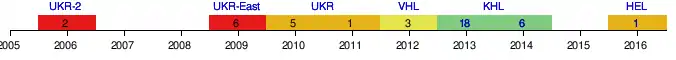 HC Donbass is six times Ukrainian champion (2011, 2012, 2013, 2016, 2017, 2018). The team was a member of the Kontinental Hockey League (KHL) during the 2012–13 and 2013–14 seasons,[1] and was the sole representative from Ukraine competing at the elite international level. Due to the war in Donbas, the team did not compete in the 2014–15 KHL season.