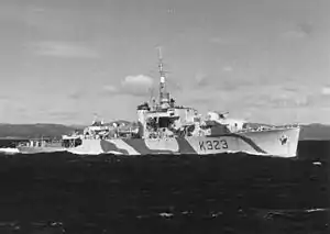 After transiting to Halifax, Springhill was sent to Bermuda in June 1944 to work up. Upon her return she was assigned to escort group EG 16 as a local escort based out of Halifax. She was made Senior Officer's Ship upon joining the group in August 1944.[2] With this unit she fought in the Battle of the St. Lawrence. She remained with the group until March 1945, when she was ordered to Derry, but quickly returned in April to undergo a tropicalization refit in preparation for service in the southern Pacific Ocean.[2] This meant installing water-cooling and refrigeration abilities and changing the camouflage pattern.[6]