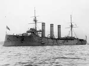 Bedford, named after the English county,[6] was laid down on 19 February 1900 by Fairfield Shipbuilding & Engineering at their Govan shipyard. She was launched on 31 August 1901, when she was christened by Charlotte Mary Emily Burns, wife of the Hon. James Cleland Burns, of the Cunard Line shipping family.[7] In May 1902 she was navigated to Devonport for completion and trials.[8] The ship was completed on 11 November 1903 and initially assigned to the 1st Cruiser Squadron of the Channel Fleet. Bedford was briefly placed in reserve at the Nore in 1906[9] before being recommissioned in February 1907 for service on the China Station.[10]