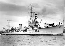 Shikari continued as a control ship for the remainder of the inter war period, first for Agamemnon and then for Centurion.[5] Shikari was present at Invergordon in September 1931 during the Invergordon Mutiny, although there was little trouble on board.[14] Amongst Shikari's commanding officers during the inter-war period was Commander Frederic John Walker, who became a notable anti-submarine warfare commander during the Second World War.[15] On 15 January 1938, Shikari was escorting Centurion from Devonport to Gibraltar across the Bay of Biscay when the heavy weather caused a fault in her port engine, forcing the destroyer to put into Lisbon.[16] On 2 February 1939, Shikari was involved in a collision with the destroyer Griffin off Malta, with Griffin's hull being damaged near the stern.[17][18]