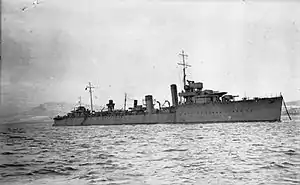In January 1926, Warwick recommissioned into the 5th Destroyer Flotilla.[8] On 6 January 1927, Warwick along with the destroyers Velox, Vancouver and Vortigern, escorted the battlecruiser Renown carrying The Duke and Duchess of York at the start of the Royal couple's tour of Australia and New Zealand.[23] In June–July 1929, the 5th Destroyer Flotilla, including Warwick accompanied the 2nd Cruiser Squadron on a tour of the Baltic.[24] In November 1930, Warwick was relieved in the 5th Flotilla by Vesper, with Warwick going into reserve at Chatham.[25][26] In January 1931, Warwick was ordered to replace Valhalla in the 6th Destroyer Flotilla,[26] but on 30 March 1931, she re-entered reserve at Sheerness, and underwent a refit during which her boilers were retubed from August 1931 to January 1932.[8] After this refit, Warwick recommissioned into the 5th Destroyer Flotilla.[8] On 31 January 1934, Warwick was in collision with the destroyer Vortigern off Gibraltar, with both ships slightly damaged.[8][27] In October 1934,[lower-alpha 2] Warwick was replaced in the 5th Flotilla by the newly completed destroyer Echo,[28] and after being refitted at Devonport between 22 October and 9 November that year, went into reserve at Devonport.[8] With the onset of war in 1939 Warwick was re-activated, re-commissioning in August, and joining the fleet at Plymouth in September.