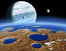 | Europa | Jupiter | Colonization of Europa | Thought to have a subsurface ocean maintained by geologic activity, tidal heating, and irradiation.[33][34] The moon may have more water and oxygen than Earth and an oxygen exosphere.[35] |
