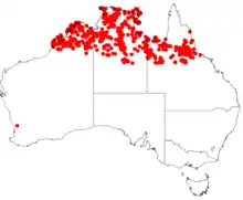 Hakea arborescens is endemic to the top end in the Northern Territory,[2] the Kimberley region of Western Australia[1] and northern Queensland.[3] It is often found among coastal dunes, inland on soils that are alkaline,[2] along creek banks or in low-lying areas such as swamps. Hakea arborescens is often found growing over and around areas of sandstone, quartzite and limestone and usually part of monsoon forest or Eucalyptus woodland communities.[3]