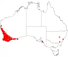 A variable and common species, widespread from coast of Northampton to Israelite Bay.[6] Grows in heath or woodland on sand, loam, lateritic gravel or limestone. Requires a sunny or semi-shaded aspect with good drainage. May be used for hedging and wildlife habit and is drought and frost tolerant.[5]
