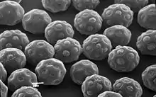 The pollen grains are nearly ball-shaped, 18-38 µm in diameter, with 12-29 pores scattered all over the surface (pantoporate), just like it is typically for the goosefoot-family. The species differ from each other in pollen diameter and number of pores, the southern species with the smallest and the northern species with the largest pollen grains.[1]