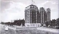 The Sisson Hotel, was constructed in 1918 on the site of Paul Cornell’s first Hyde Park House hotel opened in 1857, which had been destroyed by fire in 1879 at Lake Michigan and 53rd Street. It is credited as the first high rise on the South Side of Chicago excluding buildings associated with the World's Columbian Exposition. It was constructed adjacent to Lake Michigan before the landfill projects that moved the shoreline eastward and eventually cleared the way for the construction of Lake Shore Drive. In 1923, proprietor Harry W. Sisson was linked to the Ku Klux Klan by the American Unity League, which resulted in a boycott by Catholics and Jews. The reaction was a movement to urge Klansmen to stay at the hotel.[1]