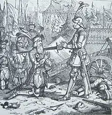 Born in the year 1435 in Blickensdorf near the Zug, Hans Waldmann grew up in economically favourable circumstances. Little is known about his father, who presumably died in 1436. His mother, née Katharina Schweiger, was the daughter of a salt merchant from Lucerne, who had already acquired the citizenship in Zurich in 1409, and inherited his significant fortune.[3] It can hardly have been the financial pressure, but rather the choice of the parents that sent Waldmann to a tailor's apprenticeship before a second attempt at a tanner. In 1452 Waldmann together with his brother Heini and younger stepbrother Hensli Truttmann acquired the citizenship in Zurich, but it is not known when the family moved to Zurich.[3] In his youth he was involved in a variety of fights, insults and arguments. Together with his brother Heini, Waldmann also took part in a Freischarzzug in Konstanz and Kempten in 1458 and 1460. In the same year he ran as an ensign before the Zurich contingent, which conquered Thurgau with the Confederates. By marrying Anna Landolt, the widow of the Einsiedeln Amtmann – or bailiff – Ulrich Edlibach, Waldmann not only secured a considerable fortune, but also access to the family iron trade and even the position of Amtmann of the Einsiedeln monastery.[4]