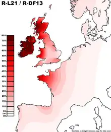 R-L21 or R1b1a2a1a2c, also known as R-M529 or R-S145, is a Human Y-chromosome DNA haplogroup. It is often linked to the Insular Celts.[1] One subclade, R-DF13 comprises over 99% of bearers. It is dominant among males in Ireland, Scotland, Wales and Brittany, present in high frequencies in England and western France and present also to a lesser extent in Iberia, Scandinavia and the Low Countries.[2]