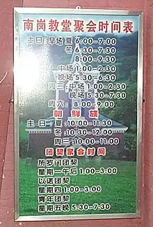 The Nangang Christian Church holds a Chinese-language service and as of 2002, an ethnic Korean service. As of 2017, the church hosts an English fellowship with a mixed congregation of Chinese nationals and overseas citizens. The Sunday morning English service is held from 10:20 - 11:30 AM.