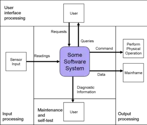 The five components—inputs, outputs, user interface, maintenance, and processing—are added to a system model template to allow for modeling of the system which allows for proper assignment to the processing regions.[1] This modeling technique allows for creation of a hierarchy of detail of which the top level of this hierarchy should consist of a context diagram.[1] The context diagram serves the purpose of "establish[ing] the information boundary between the system being implemented and the environment in which the system is to operate."[1] Further refinement of the context diagram requires analysis of the system designated by the shaded rectangle through the development of a system functional flow block diagram.[1] The flows within the model represent material, energy, data, or information.[2]