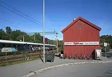 Freight traffic to Hauketo was limited and mostly served a building materials outlet located at the station.[6] The cargo annex of the building received an upper story with an apartment in 1967.[7] The cargo handling was discontinued during the 1970s, and the ramp and cargo annex were both demolished.[3] The station became unmanned on 29 September 1980, losing the ticket office.[8] The station building was later converted to a pizzeria. The station area was gradually redeveloped and received bus station.[6]