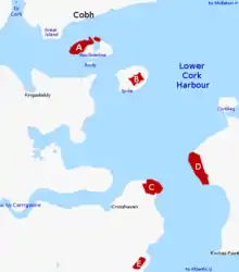 Plan of lower harbour showing Naval Base relative to other installations: (A) Haulbowline Naval Base, (B) Fort Mitchel/Westmoreland, (C) Fort Meagher/Camden, (D) Fort Davis/Carlisle, (E) Fort Templebreedy