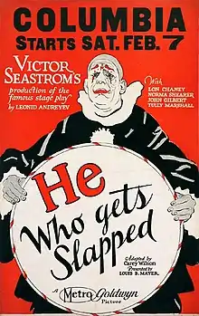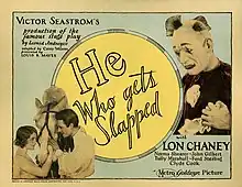 He Who Gets Slapped is a 1924 American silent psychological thriller film starring Lon Chaney, Norma Shearer, and John Gilbert,[3][4] and directed by Victor Sjöström (credited as Victor Seastrom). The film was written by Victor Seastrom and Carey Wilson, based on the Russian play He Who Gets Slapped (Тот, кто получает пощёчины; Tot, kto polučájet poščóčiny) by playwright Leonid Andreyev, which was completed by Andreyev in August 1915, two months before its world premiere at the Moscow Art Theatre on October 27, 1915.[5] A critically successful Broadway production, using an English language translation of the original Russian by Gregory Zilboorg, was staged in 1922, premiering at the Garrick Theatre on January 9, 1922, with Richard Bennett (actor) playing the "HE" role on stage.[6][7] The Russian original was made into a Russian movie in 1916.