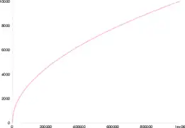 A schematic Heaps-law plot. The x-axis represents the text size, and the y-axis represents the number of distinct vocabulary elements present in the text. Compare the values of the two axes.