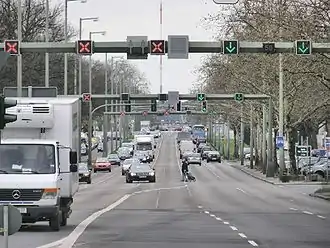 Heerstraße (German pronunciation: [ˈheːɐ̯ˌʃtʁaːsə] ⓘ; literally: Army Street) runs from Theodor-Heuss-Platz in Berlin-Charlottenburg to the western city border of Berlin in the locality of Staaken in the borough of Spandau. It is part of Bundesstraße 5; from Theodor-Heuss-Platz to Wilhelmstraße it is forms part of Bundesstraße 2. With a length of around 10 kilometres, it is one of the longest streets in Berlin and an important commuter route. The street is a five-lane expressway (Kraftfahrstraße), depending on traffic flow the middle lane is available during rush hours in the morning (eastbound) and in the evening (westbound).