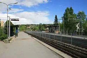 Hellerud is a station on the Oslo Metro system which is shared by two lines, line 2 (the Furuset Line) and line 3 (the Østensjø Line). These two lines diverge immediately east of the station with the eastbound Furuset Line track first diverging southwards before running under the Østensjø Line in order to avoid having the main tracks cross each other. The lines share the same track and platforms. The station is located in a mostly residential area, formerly called the Hellerud borough. Apartment buildings located mainly to the north side of the station.