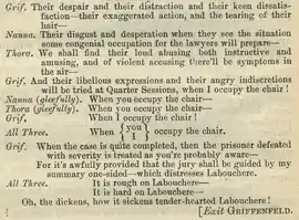 During the break in his Parliamentary career, Labouchère gained renown as a journalist, editor, and publisher, sending witty dispatches from Paris during the Siege of Paris in 1870–1871, noting the eating of zoo elephants, donkeys, cats and rats when food supplies ran low.[16] This series of articles helped restore the circulation of the Daily News, in which he had bought a stake in 1868. His unflinching style gained a large audience for first his reporting, and later his personal weekly journal, Truth (started in 1876), which was often sued for libel.[17] With his inherited wealth, he could afford to defend such suits.[1] Labouchère's claims to being impartial were ridiculed by his critics, including W. S. Gilbert (who had been an object of Labouchère's theatrical criticism) in Gilbert's comic opera His Excellency (see illustration at right). In 1877, Gilbert had engaged in a public feud with Labouchère's lover, Henrietta Hodson.[18]