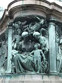 The Queen Victoria Monument in Lancaster, displays a sculpture of the queen guarded by four monumental lions, beneath them are four allegories to freedom, wisdom, truth and justice complete with a generous collection of putti; and four bas-relief friezes of fifty-three eminent Victorians, two of whom were women.