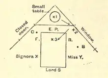 In 1908, the Society for Psychical Research (SPR) appointed a committee of three to examine Palladino in Naples. The committee comprised Mr. Hereward Carrington, investigator for the American Society for Psychical Research and an amateur conjuror; Mr. W. W. Baggally, also an investigator and amateur conjuror of much experience; and the Hon. Everard Feilding, who had had an extensive training as investigator and "a fairly complete education at the hands of fraudulent mediums."[19] Three adjoining rooms on the fifth floor of the Hotel Victoria were rented. The middle room where Feilding slept was used in the evening for the séances.[20] In the corner of the room was a séance cabinet created by a pair of black curtains to form an enclosed area that contained a small round table with several musical instruments. In front of the curtains was placed a wooden table. During the séances, Palladino would sit at this table with her back to the curtains. The investigators sat on either side of her, holding her hand and placing a foot on her foot.[21] Guest visitors also attended some of the séances; the Feilding report mentions that Professor Bottazzi and Professor Galeotti were present at the fourth séance, and a Mr. Ryan was present at the eighth séance.[21]