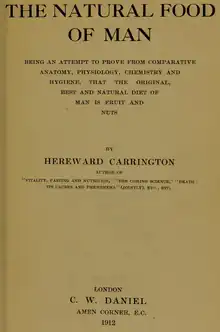 - ↑ Carrington, Hereward (16 September 1908). "Vitality, fasting and nutrition; a physiological study of the curative power of fasting, together with a new theory of the relation of food to human vitality, by Hereward Carrington... with an introduction by A. Rabagliati". New York, Rebman company. Retrieved 16 September 2019 – via Internet Archive.