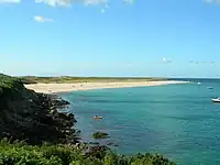 Herm is only 1+12 miles long (north-south) and less than half a mile wide (east-west).[20] In the northern part of the island are two hills, Le Petit Monceau and Le Grand Monceau. To the north of these is a common, leading to Mouisonniere Beach on the northern coast, with Oyster Point in the northwestern corner and La Pointe du Gentilhomme or Alderney Point at the northeastern corner.[30] To the east of the common is Shell Beach and to the west is The Bear's Beach, leading down to the harbour.[31] Half of the coastline of the northern part of the island is surrounded by sandy beaches; the southern half is rocky.[32] Much of Herm's bedrock is granite.[33] In 2008, Adrian Heyworth, who was at the time the island's tenant, said that two or three metres of sand were being lost annually at Alderney Point.[34] Interestingly, the northernmost point of the island, Alderney Point, sits directly south of the Isle of Portland.