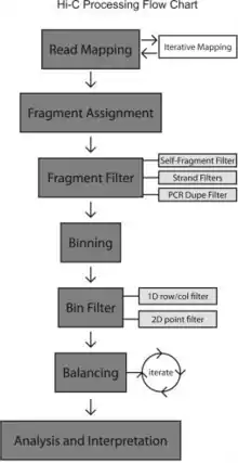 Based on their midpoint coordinates, Hi-C restriction fragments are binned into fixed genomic intervals, with bin sizes ranging from 40 kb to 1 Mb.[26] The rationale behind this approach is that by reducing the complexity of the data and lowering the number of candidate genome-wide interactions per bin, genomic bins allow for the construction of more robust and less noisy signals, in the form of contact frequencies, at the expense of resolution (though restriction fragment length still remains the ultimate physical limit to Hi-C resolution).[26][27] Bin to bin interactions are aggregated by simply taking the sum, although more focused and informative methods have also been developed over the years to further enhance the signal.[26] One such method described by Rao et al. aims to push the limit of bin size to smaller and smaller bins, eventually having > 80% of bins covered by 1000 reads each, which significantly increased the resolution of the final analysis results.[13]