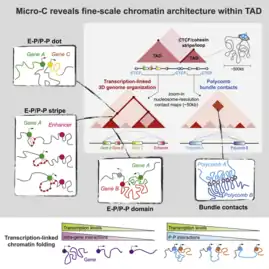 Micro-C is a version of Hi-C that includes a micrococcal nuclease (MNase) digestion step to look at interactions between pairs of nucleosomes, thus enabling resolution of sub-genomic TAD structures at the 1 to 100 nucleosome scale.[23][24] It was first developed for use in yeast and was shown to conserve the structural data obtained from a standard Hi-C but with greater signal-to-noise ratio.[23][24] When used with human embryonic stem cells and fibroblasts, 2.6 to 4.5 billion uniquely mapped reads were obtained per sample.[23][24] Hsieh et al. analyzed 2.64 billion reads from mouse embryonic stem cells and demonstrated that there was increased power for detecting short-range interactions.[23][24][25]
