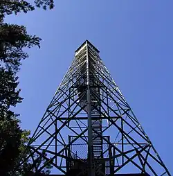 Construction of the tower began in 1936 under the auspices of the Civilian Conservation Corps.[1] It is constructed of steel with a seven-foot square 'cab' on the top[1] where the lookout was posted with various equipment including an alidade device used to help locate the location of fire outbreaks. As constructed, the tower included 123 wooden steps to provide access to the cab [1] Following a refurbishment of the tower, the wooden steps were replaced. Today, there are 133 steel steps. Originally there was a cabin or guard station, a latrine, and a garage built on the site. All but the tower have now been removed.[1]