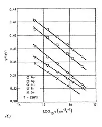 Since the high field domain starts at the electron density given by the work-function at the cathode and pulls the Schottky barrier open to a constant field in the domain, this work function can be determined precisely, and it can be used as a tool to determine the changes of the work function, as it varies depending on external parameters. As an example, it can be shown that it depends on the optical excitation in a photoconductor (See Fig. 5).[11]