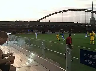 Construction of the stadium was scheduled to begin in late March to early April 2012 and to be completed during summer 2012.[2] However, construction at the site began in August, several months behind schedule, and the stadium's opening was scheduled for fall 2012 maybe as soon as late September.[18] The first Riverhounds match at the stadium was played on 13 April 2013 to a sold-out crowd, several months after the anticipated opening date.[19][20] Naming rights for the stadium were purchased by Pittsburgh-based health insurance company Highmark and the stadium was subsequently named Highmark Stadium. Once completed, the Riverhounds became only the third USL Pro team to have their own soccer-specific stadium, along with the Charleston Battery (Blackbaud Stadium) and the Rochester Rhinos (Sahlen's Stadium).[2]