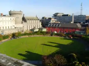 In addition to the urban settlement at Áth Cliath, the early inhabitants of Dublin may also have constructed a ringfort, or ráth, on the present site of Dublin Castle. This would have been a relatively easy place to defend, being the highest point in the area and surrounded by water on three sides. It could also explain why the eastern terminus of the Slige Mhór lay several hundred metres beyond Áth Cliath. If such a rath did exist, it may have been the source of the placename Druim Cuill-Choille, or "Hazelwood Ridge": according to Harris (1736), this was the city's original name, though no ancient references to such a name are now extant.