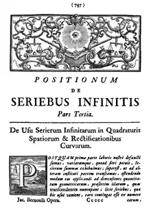 Jacob Bernoulli (1654–1705) dealt with a similar series in 1696 in the third part of his Positiones arithmeticae de seriebus infinitis.[27] Applying Nicholas Mercator's method for polynomial long division to the ratio k/(m + n), he noticed that one always had a remainder.[28] If m > n then this remainder decreases and "finally is less than any given quantity", and one has