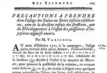 - Varignon, Pierre (1715). "Précautions à prendre dans l'usage des Suites ou Series infinies résultantes, tant de la division infinie des fractions, que du Développement à l'infini des puissances d'exposants négatifs entiers". Histoire de l'Académie Royale des Sciences: 203–225.