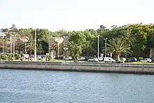 On 12 October 1897, King D. Carlos arrived in Lagos by boat, accompanied by his wife Amélia de Orleães.[106] The ceremony began with the arrival of the escaleres bringing the royal couple and the other guests, which passed through the middle of two wings formed by hundreds of boats decorated for the purpose, and where a large crowd of people launched firecrackers and greeted the kings.[106] The city of Lagos was also decorated for this visit, with ornaments in every street from Constituição Square to Porta de Portugal Street, while quilts hung from the windows.[106] The royal couple disembarked at Constituição Square and proceeded to the Santa Maria Church, then proceeded to the Paços do Concelho, where a speech was heard by the mayor and a meal was taken.[127] During the ceremony, the royal couple laid the first stone for the construction of the wall, although the work never got underway.[128] In 1902, the government ordered repairs to be made to the walls between Ribeira and Porta de Portugal, after many complaints by the municipality.[129]
