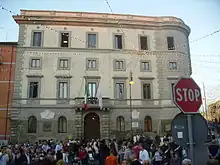 In 1564 the seal of the Marinese community appeared for the first time, depicting a knight carrying a banner (which basically remained unchanged over the centuries);[63][64] in 1566 the new "Statutes" were issued,[52] and in 1572 the "Bandi, provisioni et ordinationi" on gambling, blasphemy and brawling:[63] both documents were lost as a result of the Anglo-American bombings that devastated the municipal archives during World War II;[65] also in 1566, the construction of Palazzo Colonna was one-quarter complete, including the peperino entrance staircase,[63] and the new thoroughfare of Via Roma was fully inhabited.[63]