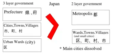 Both Tokyo City and Tokyo Prefecture were replaced in 1943 by a single Tokyo Metropolis (都). In Tokyo's case, the 35 urban wards were merged into 23, which were transferred to the current Tokyo Metropolis along with the outlying cities of Tokyo Prefecture, such as Machida, Tokyo as well as towns and village units.