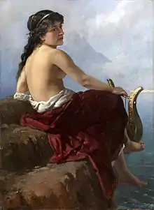 There are at least two other women poets who wrote in the style of Sappho: Erinna of Teos or Telos (c. late 400s BC) and Nossis of Locri (c. 300 BC). Erinna's Distaff and epigrams lament her childhood friend Baucis in a manner which "contains echoes of Sappho."[32] Nossis of Locri wrote three epigrams in a similar style, one of which bears striking resemblance to the floral eroticism found in Sappho's works. It reads as follows:[33]