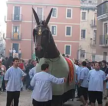 The Santa Tecla Festival takes place at Tarragona from 15 to 24 September and includes the saint's day, 23 September.[52] A number of animals, real and mythical, are impersonated in the parades that form a major part of the festivities. Among them is a larger-than-life Mulassa (mule) carried by two dancers who are hidden under its skirts, apart from their legs.